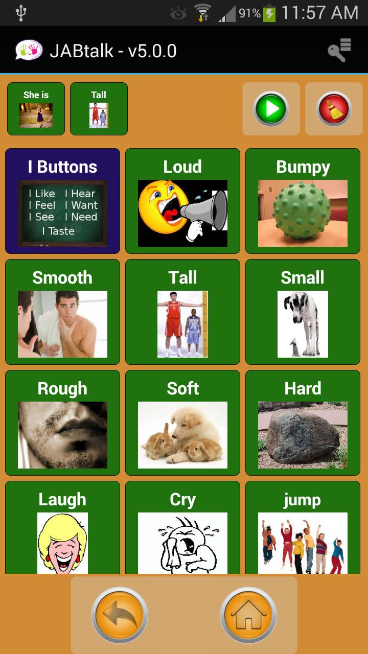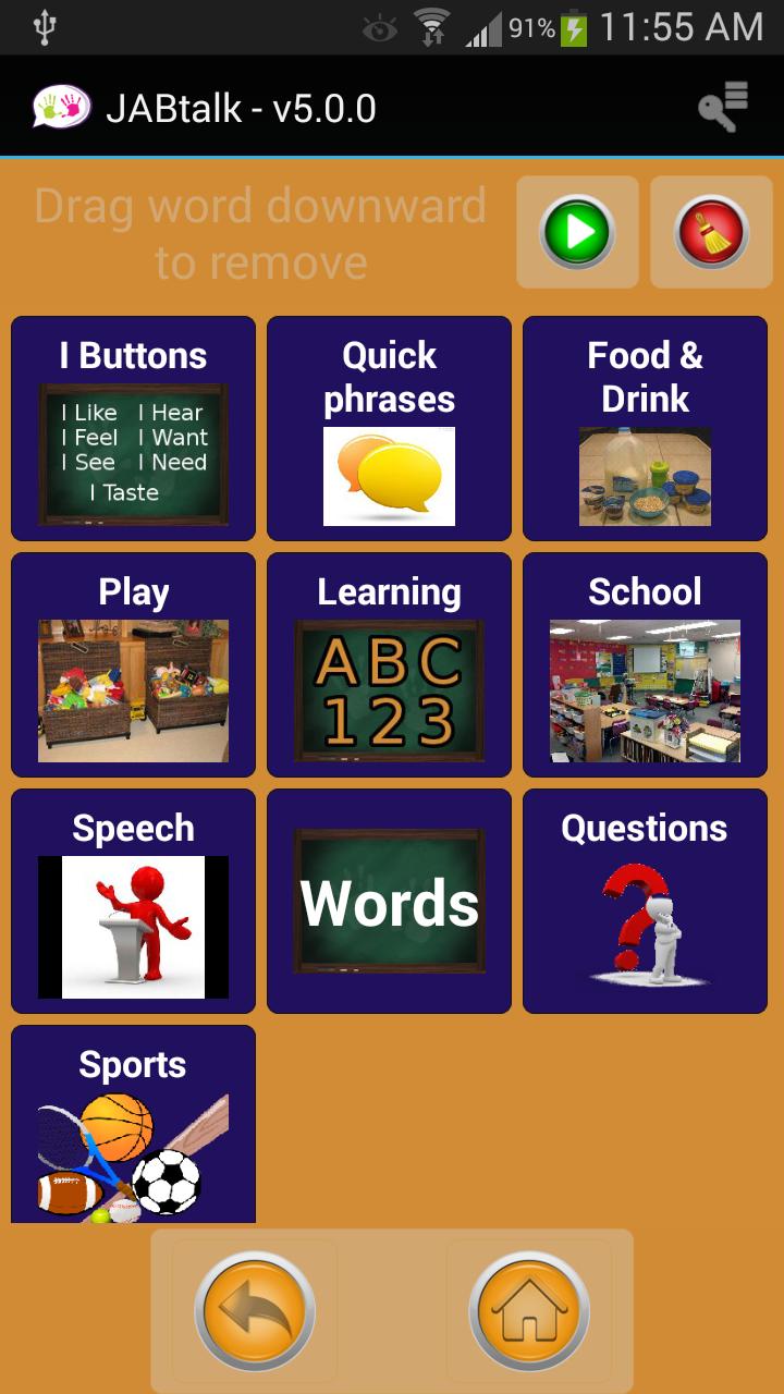 JABtalk es una aplicación de comunicación de libertad de expresión diseñada para ayudar a los niños y adultos no verbales a comunicarse. Los terapeutas del habla comúnmente se refieren a JABtalk como un dispositivo de comunicación aumentativa y alternativa fácil y efectiva (AAC). Al combinar voz e imágenes personalizadas con una interfaz de usuario extremadamente simple, JABtalk ofrece una solución de voz que es divertida de usar y fácil de aprender. Originalmente diseñada como una herramienta de comunicación para niños con necesidades especiales, JABtalk se ha convertido en una herramienta de comunicación utilizada por niños con necesidades especiales, pacientes con accidente cerebrovascular, niños pequeños, patólogos del habla y lenguaje y otros.