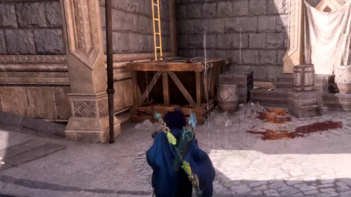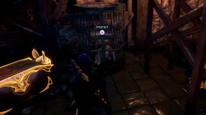 Once you've done this, look to the right of the cage and attack the wooden shelf here. Doing this will also knock down the wooden beam behind it, creating an easier path back to the sacrificed bodies you just found.