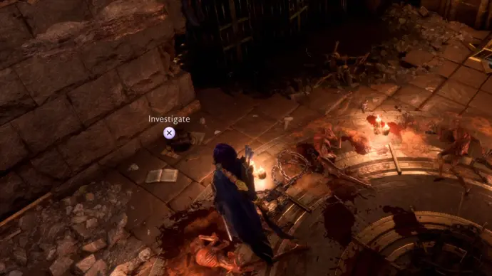 Slide down the ramp on your left and, at the bottom of this, you'll find quite a few sacrifices placed in a circle. In this room, investigate the book to the left against the wall underneath the hanging body.